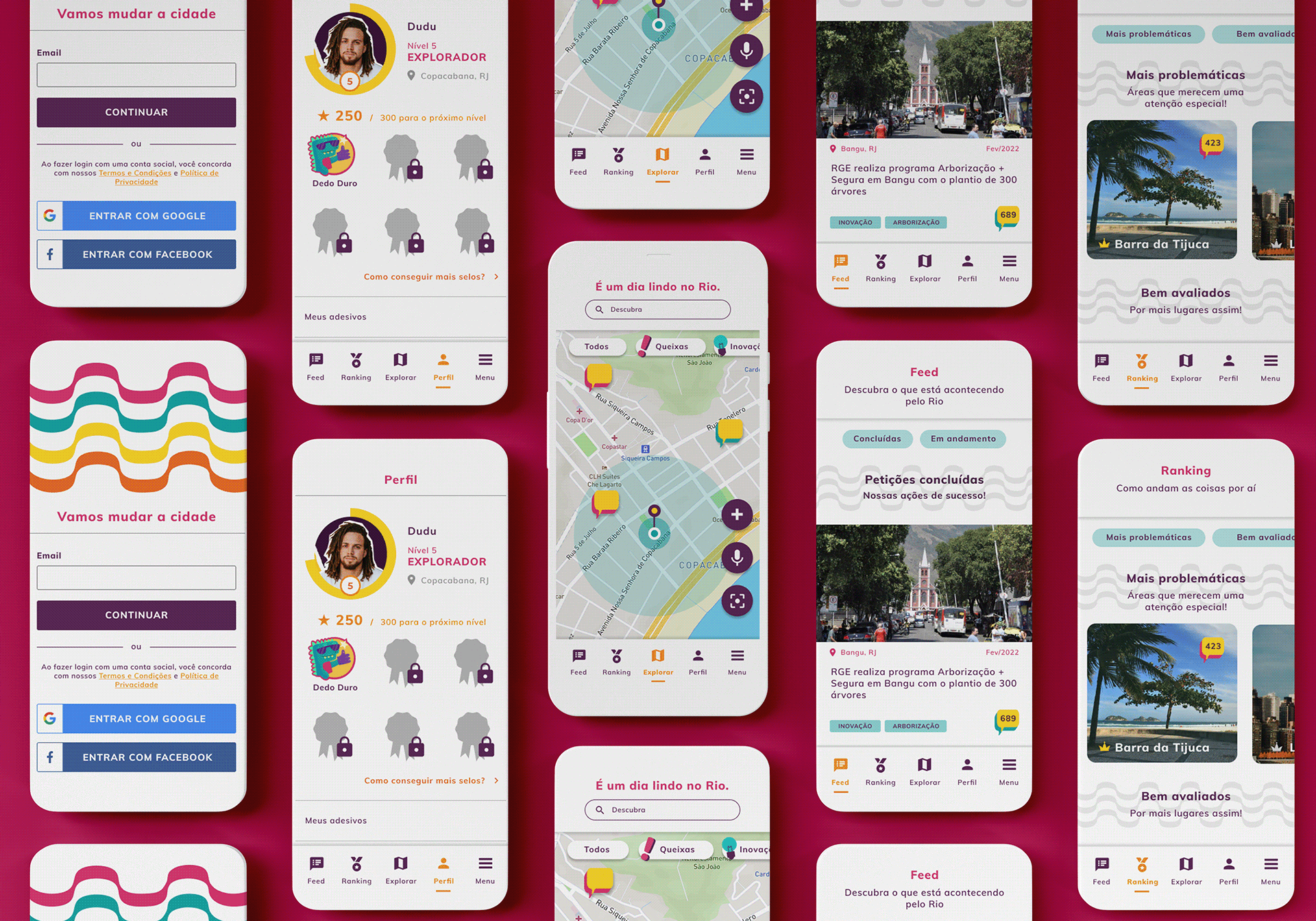 The branding balances a playful tone with civic purpose: bold colors inspired by Rio’s urban landscape, friendly typography, and simple iconography that makes reporting issues feel quick and informal rather than bureaucratic. This identity supports the product’s mission—turning everyday frustrations into collective action—while speaking in a voice that locals immediately recognize as theirs.